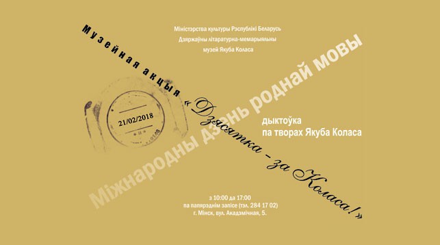 Суть музейной акции «Десятка — за Коласа!» в том, что участники, предварительно записавшись по телефону, должны будут написать диктант и определить, из какого произведения Якуба Коласа взят отрывок. Написавшие работу на десять баллов и правильно назвавшие источник получат сувениры от музея. Народный поэт Беларуси Якуб Колас — один из основателей современного белорусского языка и новой белорусской литературы. За несколько месяцев до смерти поэт написал свое знаменитое письмо-призыв о критическом состоянии белорусского языка, строки которого и по сей день являются актуальными: «Величайшим духовным богатством народа является его язык. В языке отражалась история народа, его трудовая жизнь, его борьба, его печаль и радость, его природа, его любовь и гнев».