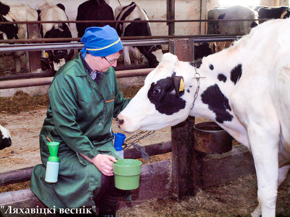– Раней мылі вымя каровы, цяпер праводзім купіроўку – апрацоўваем спецыяльнымі рэчывамі, выціраем насуха аднаразовымі сурвэткамі, і толькі тады ў ход ідзе даільны апарат. Пасля зноў гігіенічныя працэдуры, каб не дапусціць распаўсюджвання бактэрый, – расказвае Валянціна Шаўчук. Летась ад кожнай каровы яна атрымала 7173 кілаграмы малака.