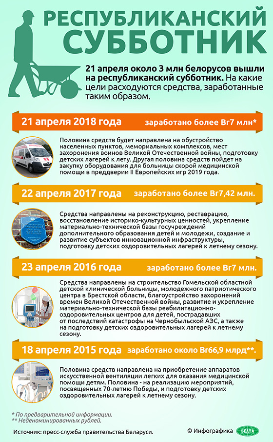 Половина средств будет направлена на обустройство населенных пунктов, мемориальных комплексов, мест захоронения воинов Великой Отечественной войны, подготовку детских лагерей к лету. Другая половина средств пойдет на закупку оборудования для больницы скорой медицинской помощи в преддверии II Европейских игр 2019 года.