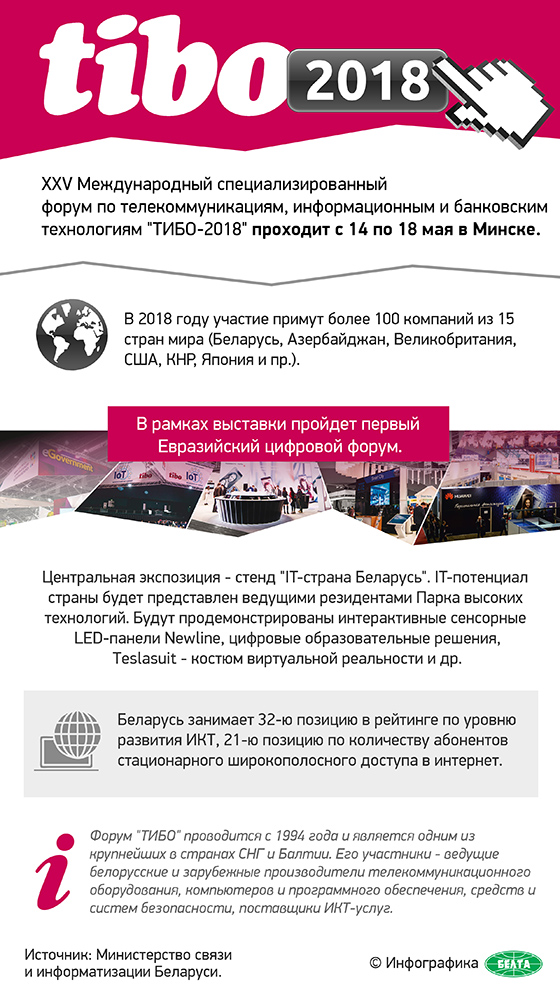 Форум «ТИБО» проводится с 1994 года и является одним из крупнейших в странах СНГ и Балтии. Его участники — ведущие белорусские и зарубежные производители телекоммуникационного оборудования, компьютеров и программного обеспечения, средств и систем безопасности, поставщики ИКТ-услуг.