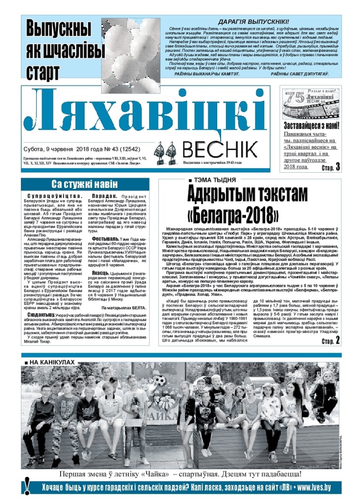 Спяшайцеся прачытаць у «Ляхавіцкім весніку» ад 9 чэрвеня 2018 года