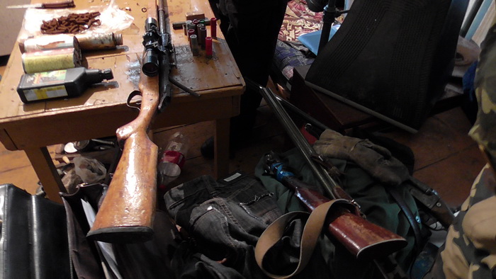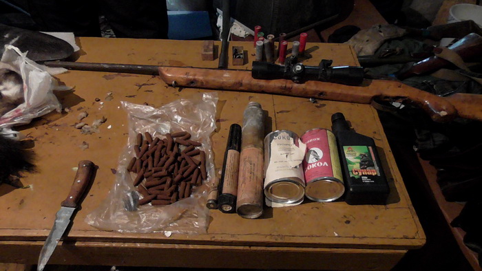 Было изъято три незарегистрированных охотничьих ружья неустановленных моделей, винтовка неустановленной модели калибра 6,5 мм, оптический прицел, вставка в охотничье ружье для стрельбы патронами к нарезному оружию калибра 5,61 мм, 98 патронов к нарезному оружию, 3 банки пороха, охотничьи и сигнальные патроны, 160 литров окрашенного дизельного топлива предназначенного для техники сельскохозяйственных предприятий, 45 литров спиртосодержащей жидкости (браги), тушка куницы и хвост бобра.