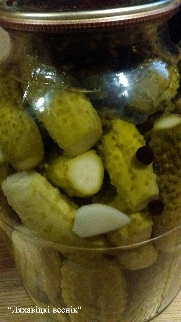 Укладзіце агуркі. Заліце кіпенем, настойце 10-15 мінут, паўтарыце яшчэ раз. На трэці заліце кіпячым расолам (на 5 літраў вады па 1 шклянцы цукру, солі, 9-працэнтнага воцату). Заліце, закатайце, перавярніце, ухутайце.