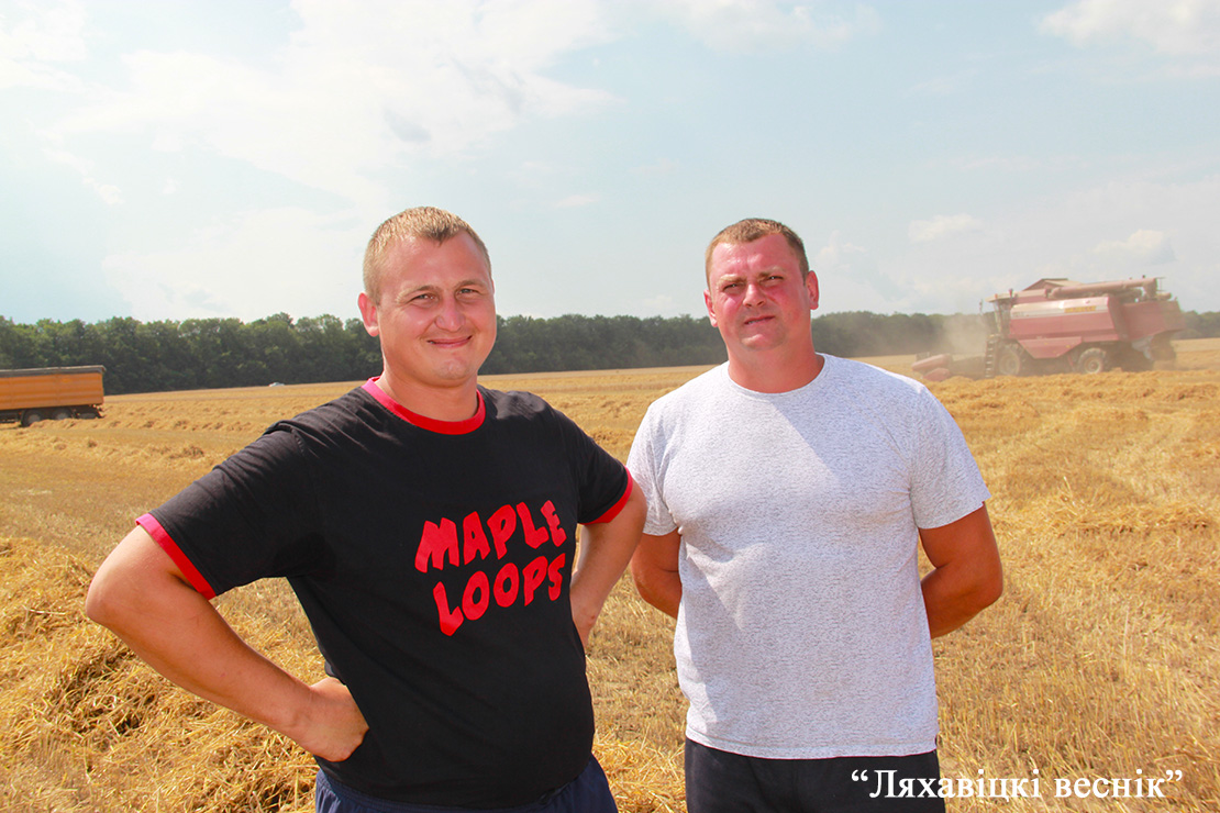 Экіпаж. Андрэй Дзянішчык і Іван Мацюшэнка з ААТ «Жарабковічы» першымі ў Ляхавіцкім раёне ўзялі «тысячу» на намалотах