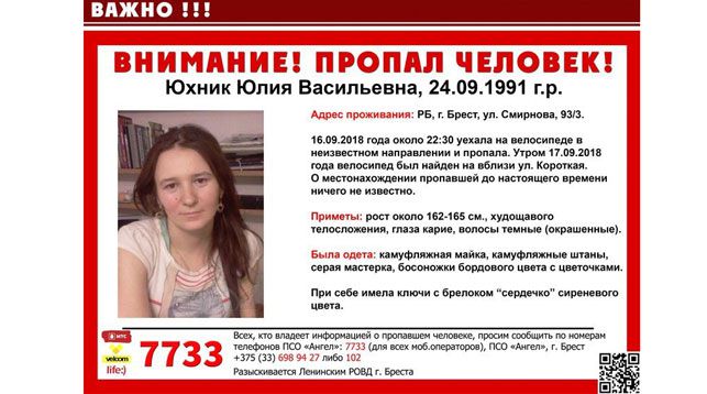 Девушка пропала вечером 16 сентября, уехала на велосипеде в неизвестном направлении. На следующий день ее велосипед был найден возле ул. Короткая. Все это время правоохранители разыскивали брестчанку. В ночь с 25 на 26 сентября ее обнаружили убитой.