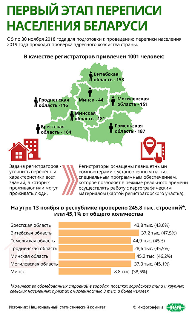 Первый этап переписи населения стартовал в Беларуси 1 ноября. До конца этого месяца регистраторы обследуют все строения — как действующие, так и находящиеся в стадии строительства, — в которых проживают или могут проживать люди к моменту проведения переписи населения в октябре 2019 года, а также нежилые строения, занятые организациями. Такая работа проводится для составления списков домов и помещений в городах, поселках городского типа и крупных сельских населенных пунктах. К ней привлечена тысяча человек, задействованы работники жилищно-коммунальных организаций всех областей.