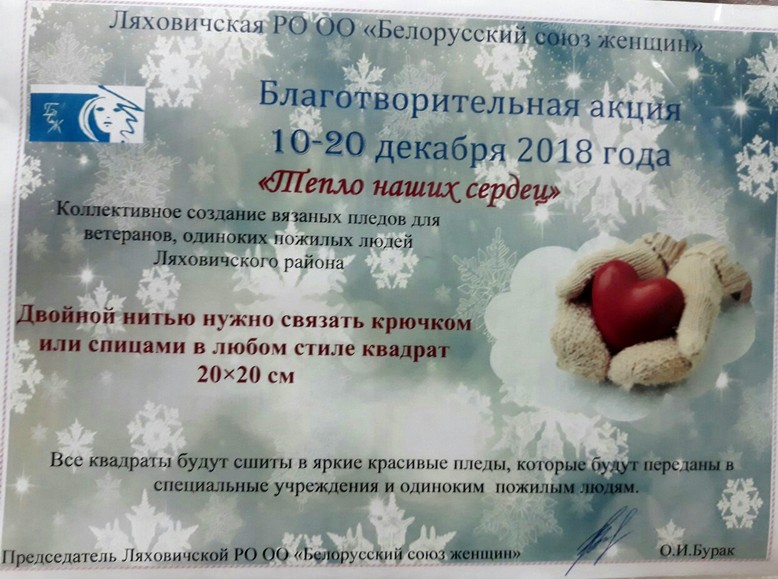 Цеплыня для сэрца і ад сэрца. У Ляхавічах раённая арганізацыя Беларускага саюза жанчын з 10 па 20 снежня праводзіць акцыю «Цяпло нашых сэрцаў»