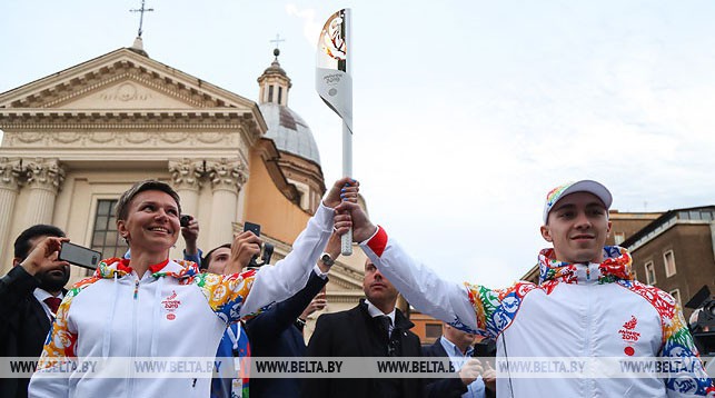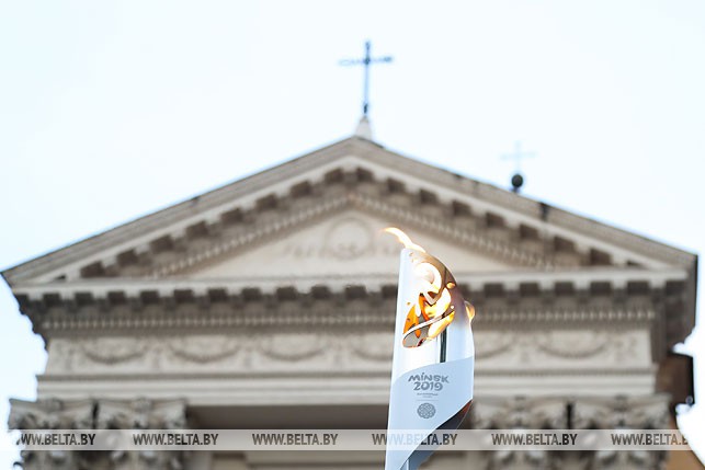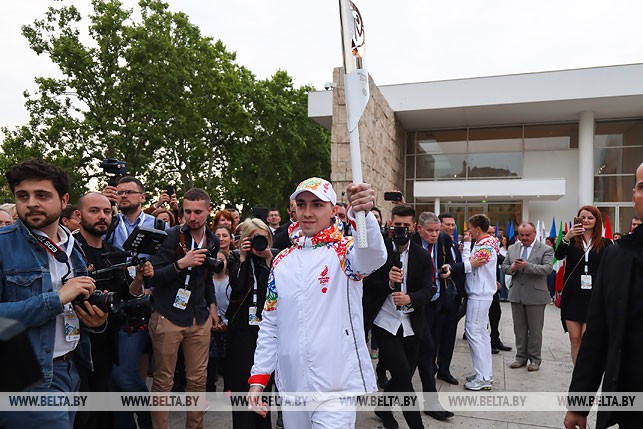 Янез Кочиянчич передал огонь игр министру спорта и туризма Беларуси, у которого переняла эстафету олимпийская чемпионка в беге на 100 м Юлия Нестеренко, а затем — триумфатор Олимпиады в Рио Владислав Гончаров. После прославленная фехтовальщица, четырехкратная олимпийская чемпионка Елена Белова отдала факел II Европейских игр белорусским байкерам.