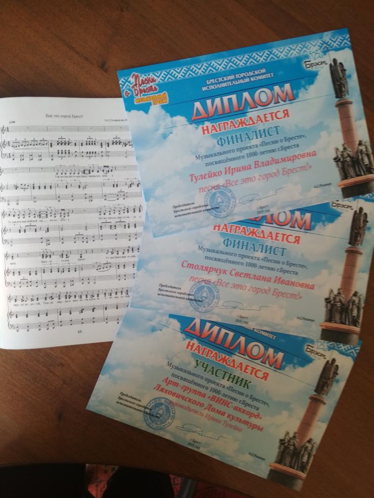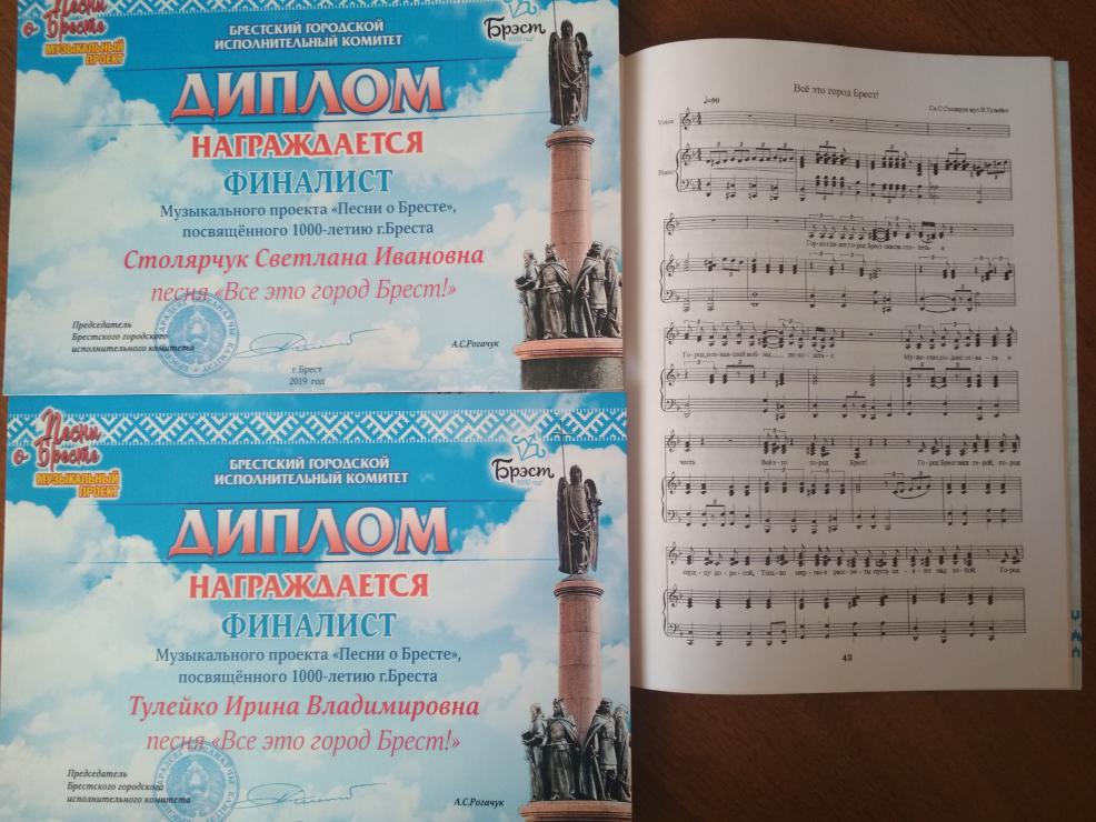 26 мая в Брестском областном общественно-культурном центре завершился большим концертом музыкальный проект Брестского горисполкома «Песни о Бресте», посвященный 1000-летию нашего областного центра. В числе 18 песен-финалистов, в сопровождении Брестского городского духового оркестра, звучала и песня, написанная Ириной Тулейко на стихи Светланы Столярчук. А начиналось все более года назад с заметки, опубликованной в «Ляхавіцкім весніку».