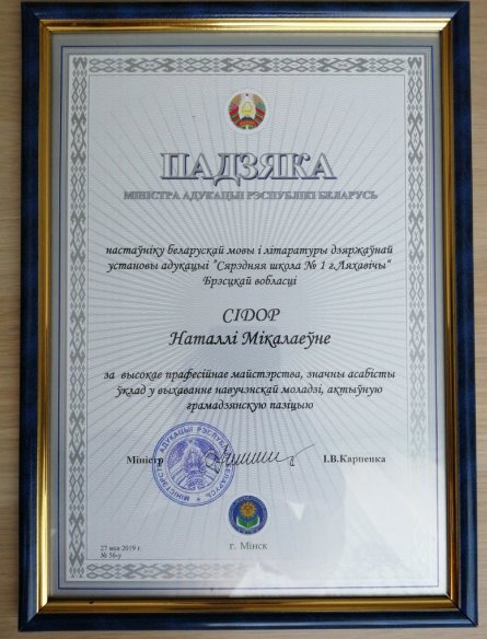 Сярод сямі педагогаў краіны, якія былі адзначаны Падзякай міністра адукацыі, – і настаўніца СШ № 1 Наталля Сідор. Такога гонару яна ўдастоена за высокае прафесійнае майстэрства, значны асабісты ўклад у выхаванне вучнёўскай моладзі, актыўную грама-дзянскую пазіцыю.