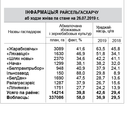 СВК «Ляхавіцкі» (старшыня Іван ВІТКО) – убрана 47 працэнтаў да плана, ураджайнасць – 51,8 ц/га.