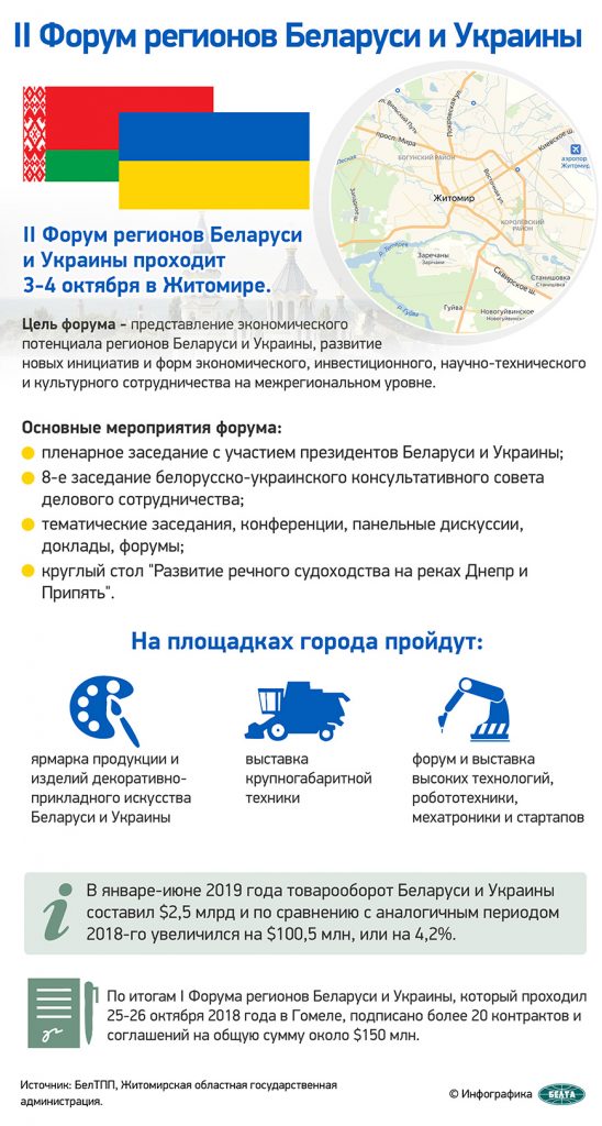 II Форум регионов Беларуси и Украины проходит 3-4 октября в украинском Житомире. Мероприятие проводится в различных форматах. Как ожидается, участие в нем примут представители правительственных и деловых кругов двух стран, руководство местных органов власти, а также главы государств, сообщает БЕЛТА.