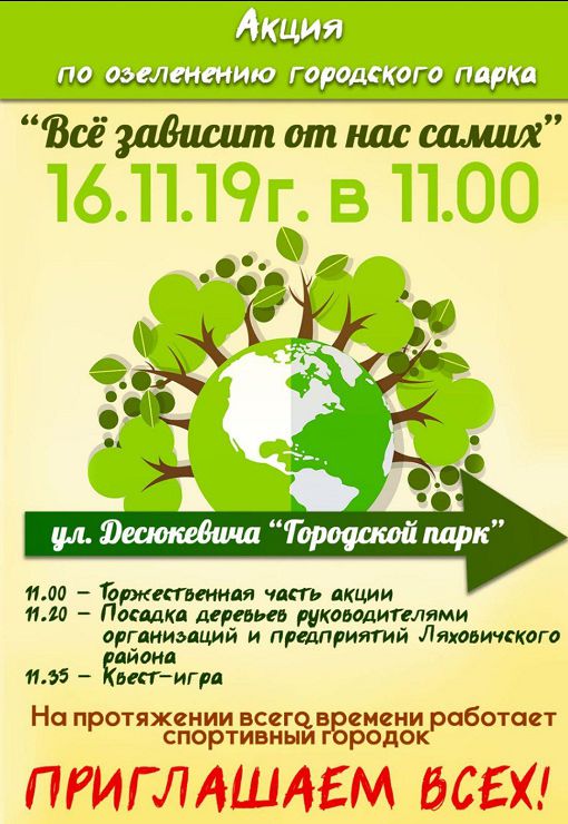 Навіны «Всё зависит от нас самих». В Ляховичах пройдёт акция по озеленению городского парка 15/11/2019 203 redakcyja