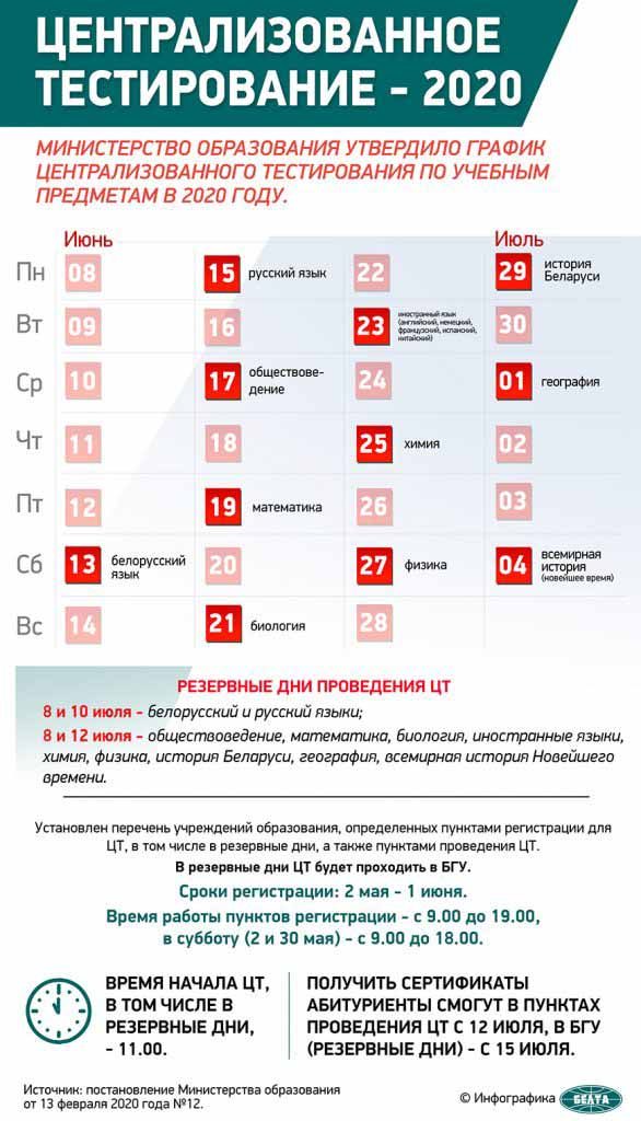 Схема регистрации абитуриентов на ЦТ в этом году изменяется в связи с эпидемиологической обстановкой. Абитуриент подает заявление по своему выбору на одном из государственных языков Беларуси. Форма размещена на сайте Республиканского института контроля знаний (РИКЗ). Заявление должно быть заполнено в электронном виде в соответствии с требованиями инструкции и отослано с личного электронного адреса абитуриента с 2 мая по 1 июня (до 18.00) на адрес электронной почты одного из пунктов регистрации абитуриентов для участия в ЦТ.